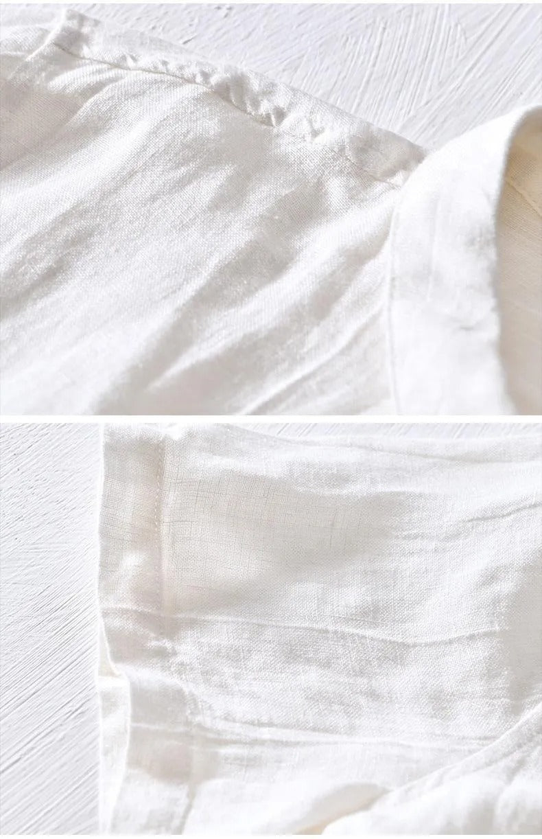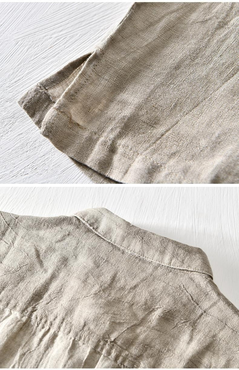 El diseño de manga corta con cuello abierto y tapeta de botones aporta un aire desenfadado sin perder la estructura de una prenda con carácter. El tejido de lino le otorga una textura única y una caída suave que realza su estilo sencillo y sofisticado.