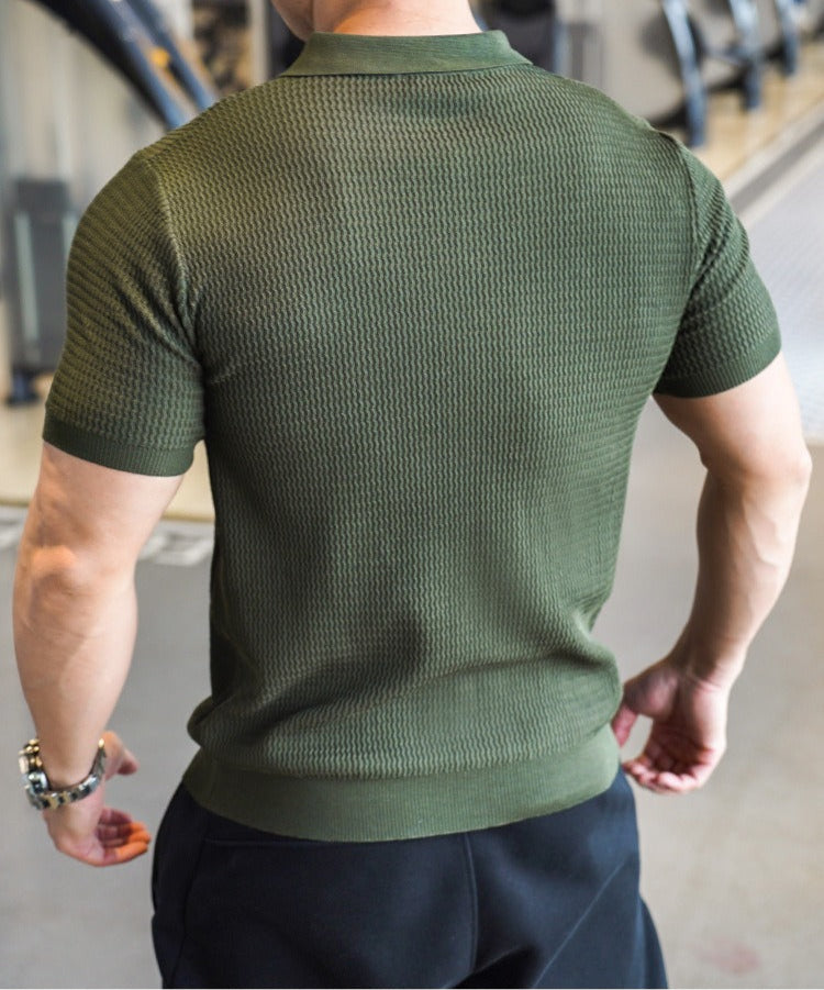 Combínalo con pantalones de corte slim o bermudas sobrias para un look equilibrado. Este polo demuestra que el estilo masculino puede ser funcional y visualmente impactante a la vez.