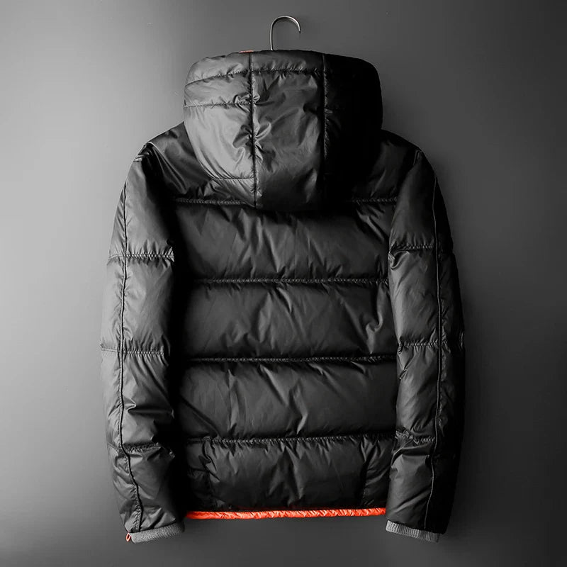 Esta chaqueta acolchada está diseñada para quienes buscan estilo y máxima protección contra el frío. Su acabado en negro clásico se complementa con un forro interior en tono naranja vibrante, creando un contraste moderno y dinámico que no pasa desapercibido.