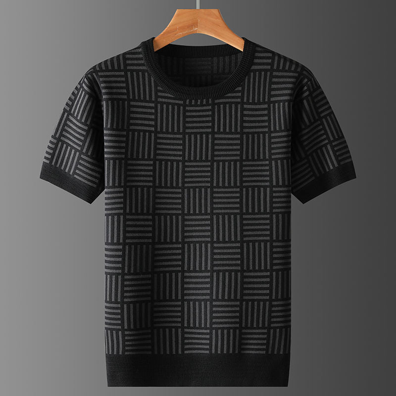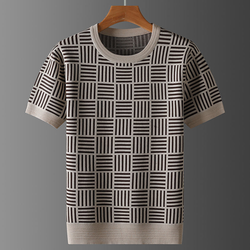 Este suéter presenta una construcción de punto con un patrón geométrico marcado que aporta profundidad visual sin resultar excesivo. La prenda se siente equilibrada desde el primer uso, con una estructura flexible que acompaña el movimiento natural del cuerpo. Su diseño de manga corta lo convierte en una pieza versátil para climas templados o para superponer en estaciones de transición.