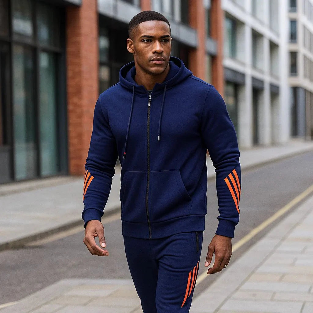El diseño con capucha y cremalleras visibles aporta un carácter moderno, mientras los detalles lineales en las mangas y el pantalón añaden dinamismo visual. Es una prenda que invita al ritmo del día: caminar, entrenar o simplemente disfrutar del aire libre.