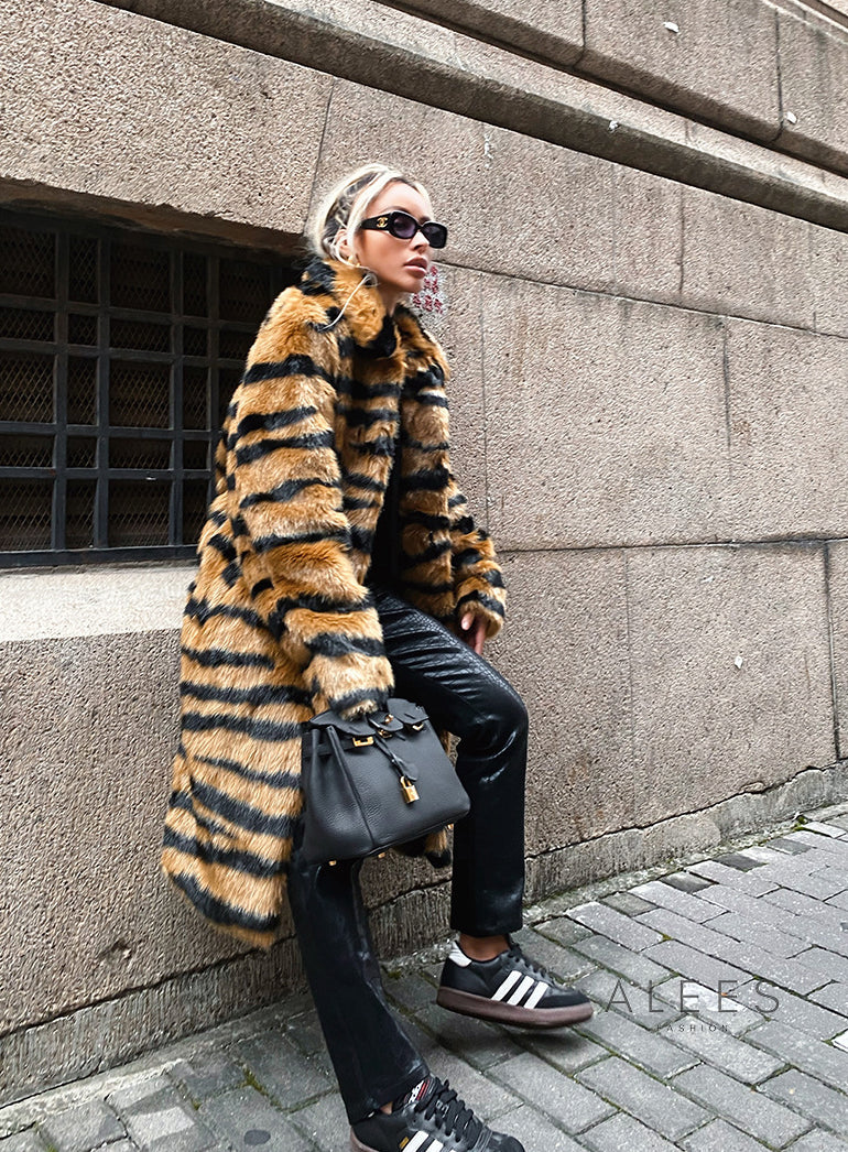 Este abrigo largo en piel sintética presenta un llamativo estampado animal inspirado en las rayas salvajes, diseñado para mujeres que buscan estilo y personalidad en sus looks de invierno. La textura suave y densa aporta un acabado lujoso, mientras que su silueta recta ofrece comodidad y elegancia en cada movimiento.