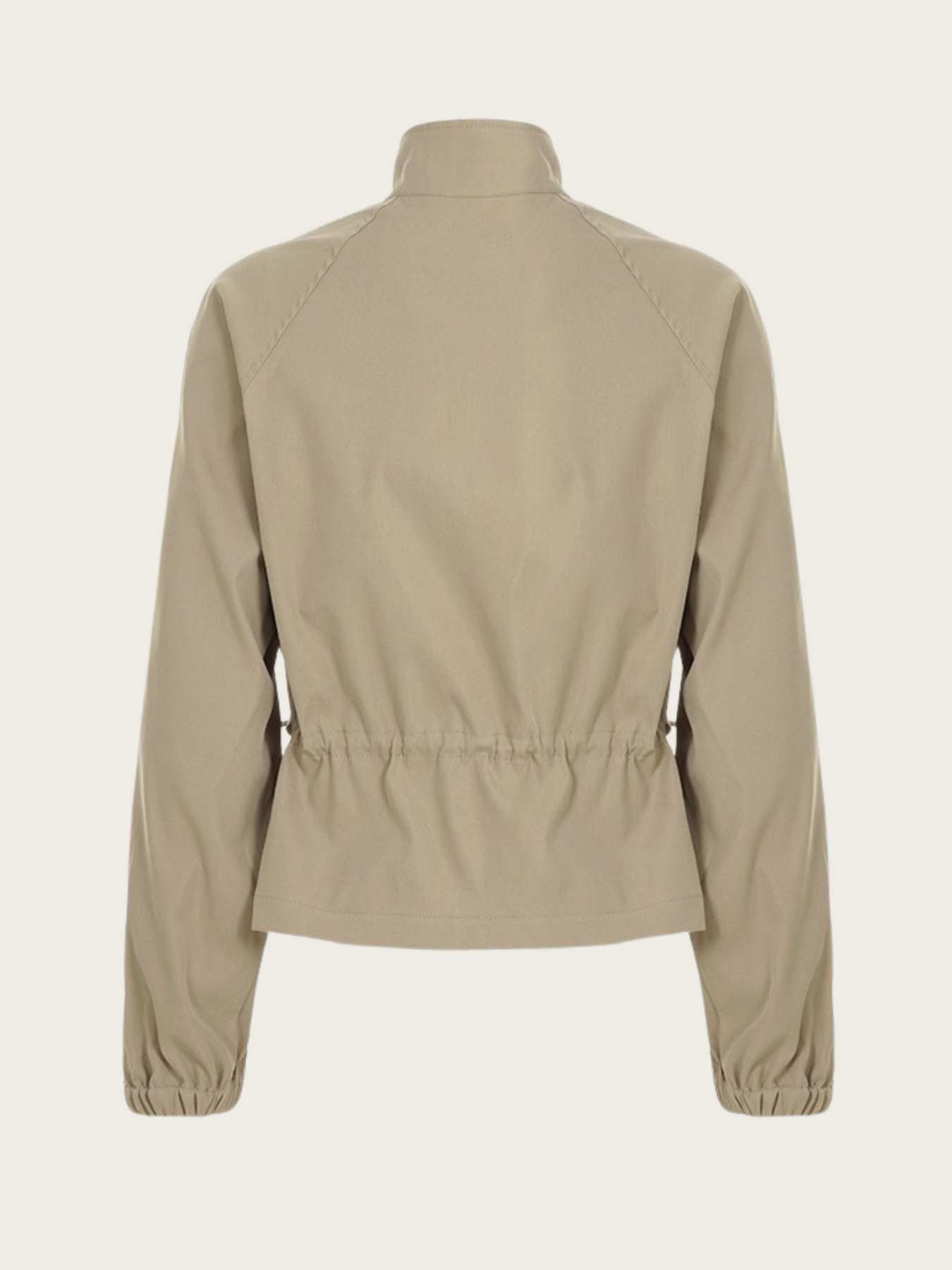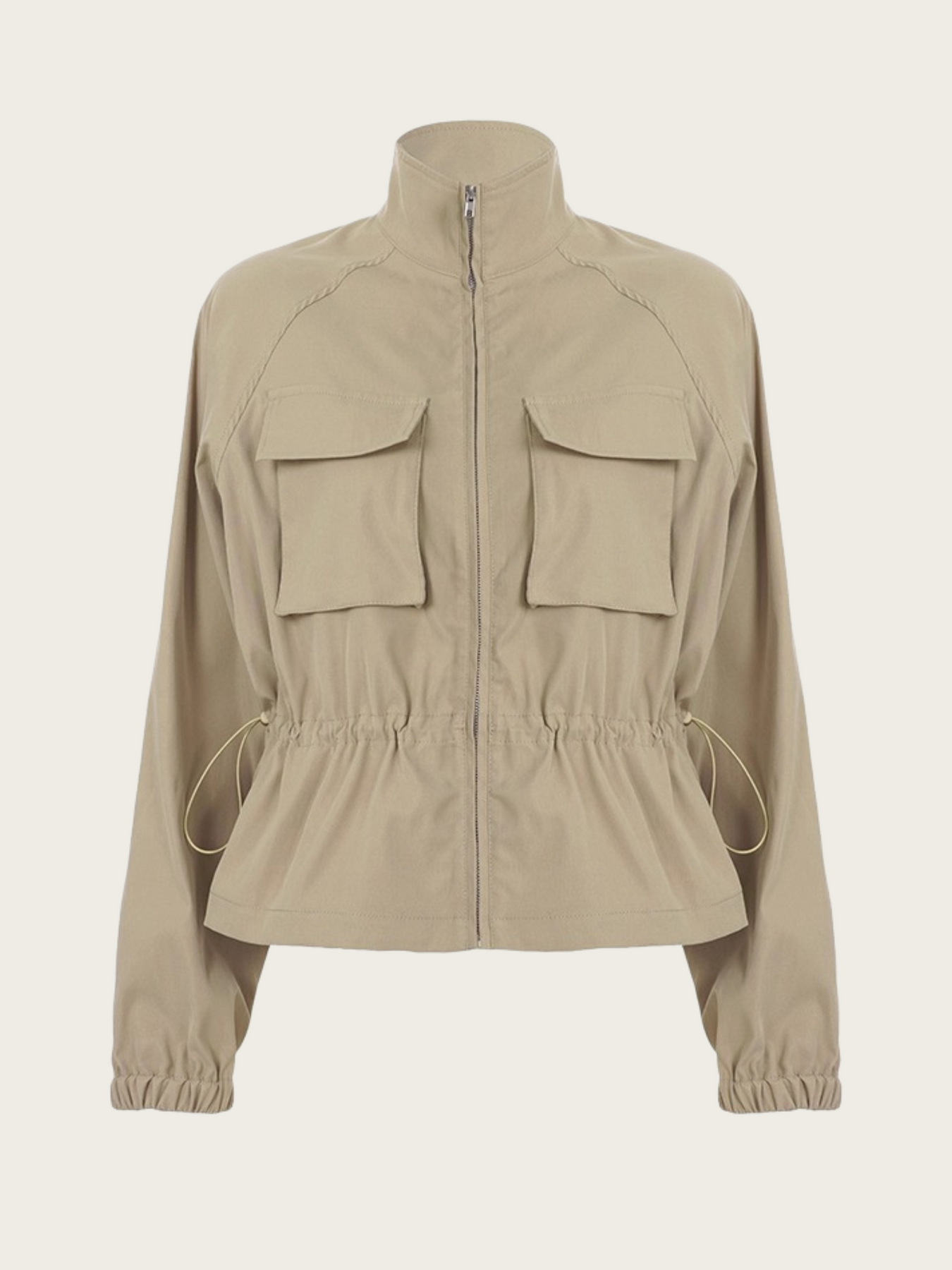 Esta chaqueta combina estilo funcional con un diseño versátil pensado para el día a día. Su corte relajado ofrece comodidad y libertad de movimiento, mientras que el cordón ajustable en la cintura permite definir la silueta de forma favorecedora según cada ocasión.
