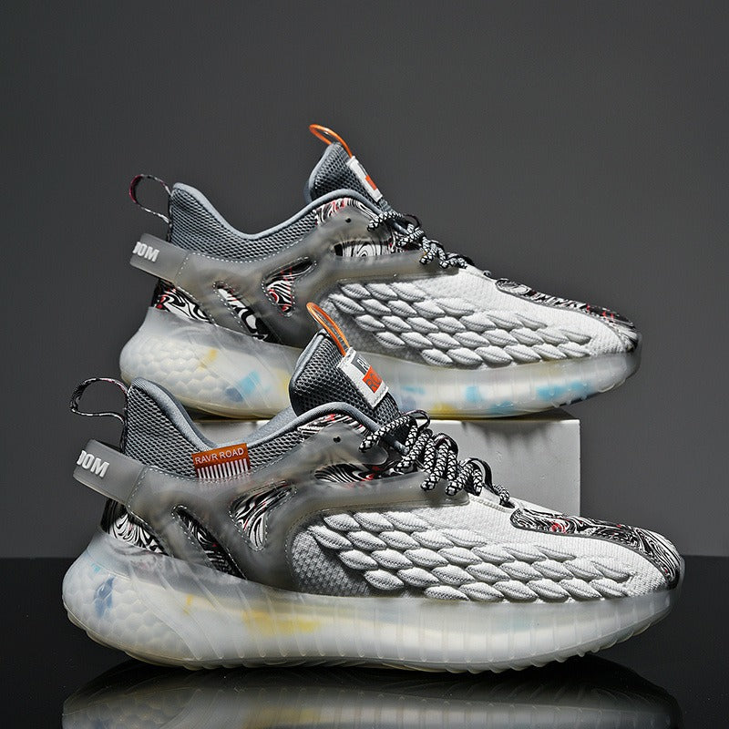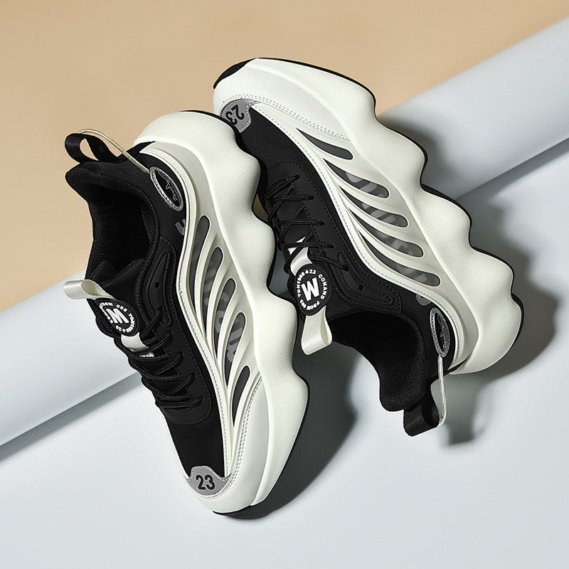 Estas zapatillas deportivas para hombre están confeccionadas con paneles de malla técnica y detalles reforzados que aportan ventilación, soporte y una estética impactante. La suela gruesa con diseño ergonómico ofrece máxima amortiguación en cada paso, ideal para jornadas activas o looks urbanos con personalidad.